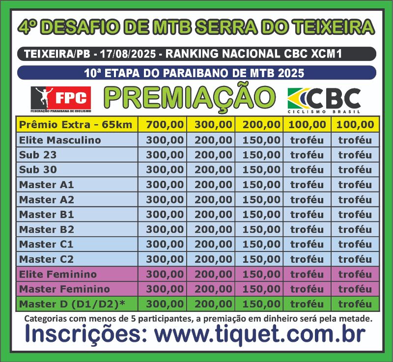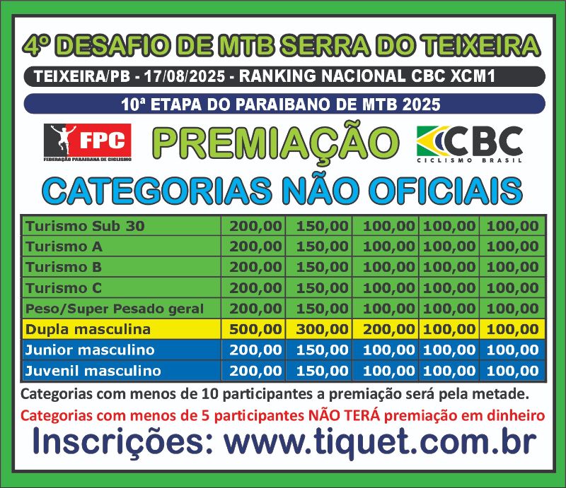 | Turismo Fem. Sub 30 | R$80,00 | R$90,00 | R$100,00 |