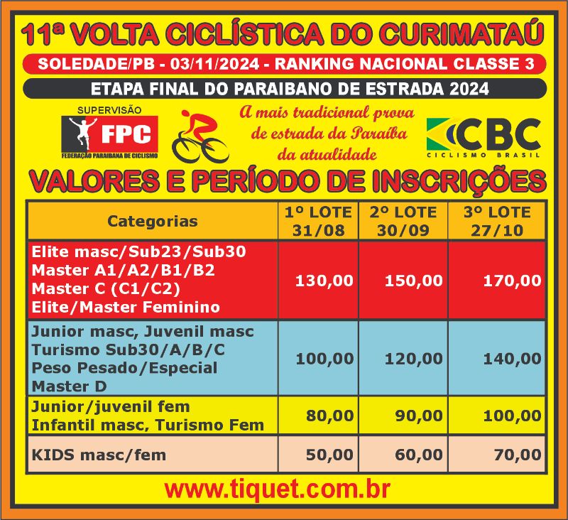 | Sub-23 | R$130,00 | R$150,00 | R$170,00 |