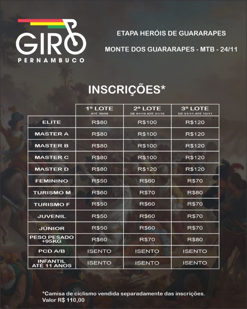 | Elite Masculino | R$80,00 | R$100,00 | R$120,00 |