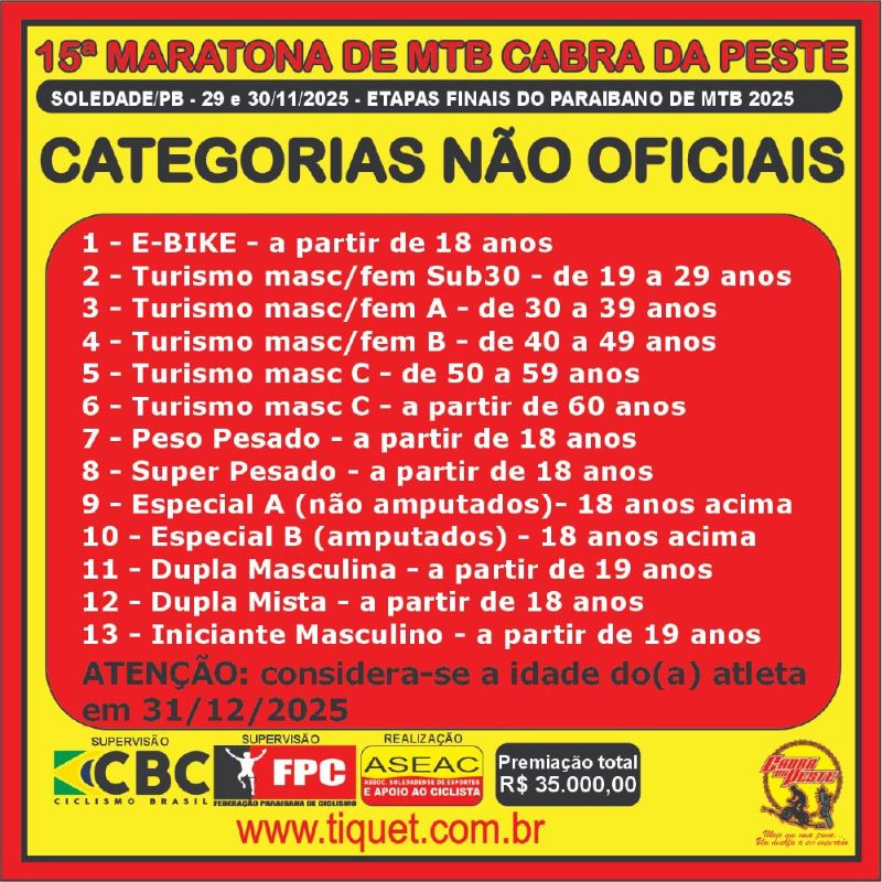 | Especial A - Não Amputados | R$125,00 | R$140,00 | R$150,00 |