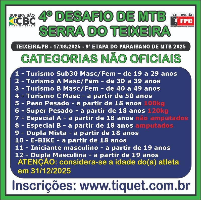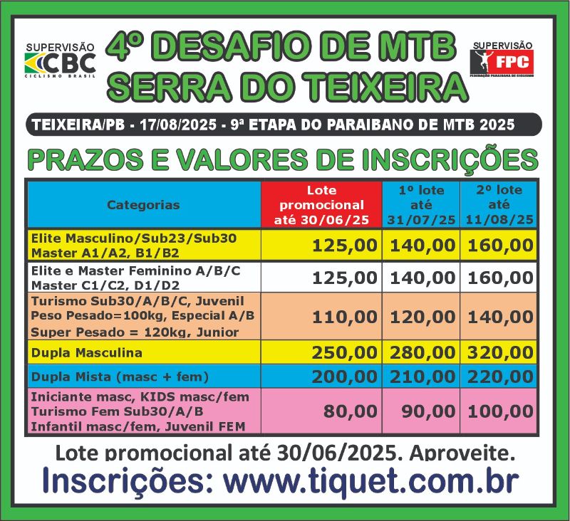 | Turismo Fem. Sub 30 | R$80,00 | R$90,00 | R$100,00 |